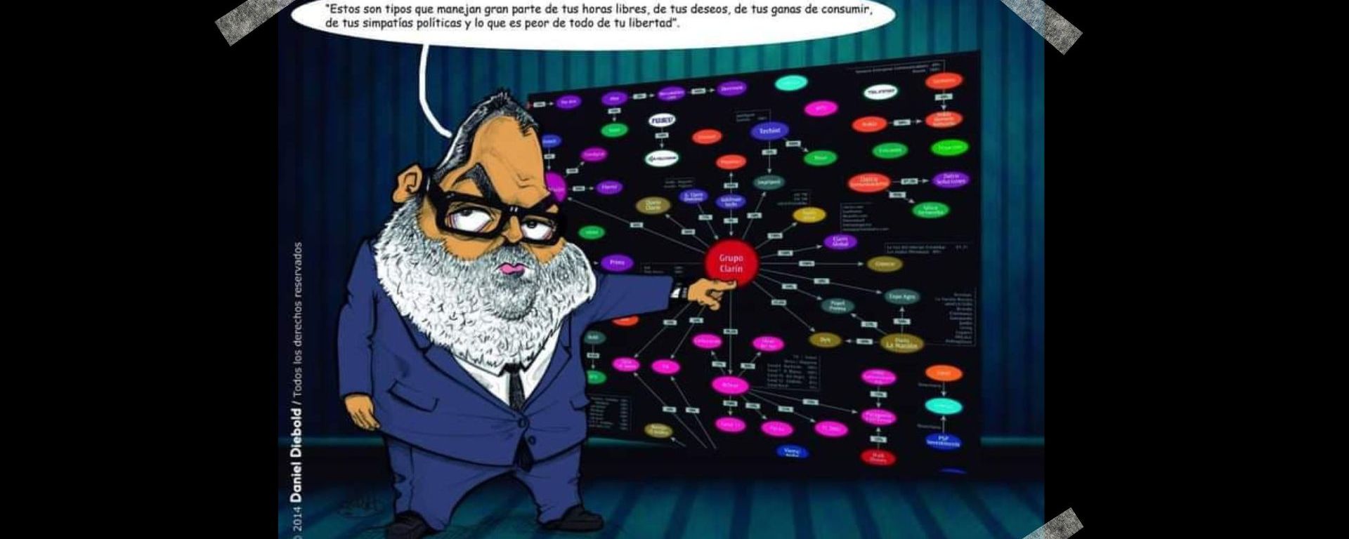 “Esto que estás viendo es la primera vez y, quizás, la última que lo veas en la televisión argentina. Técnicamente, esto es un mapa de medio. Mirá cómo se vinculan todos, parece un rompecabezas, partecitas chiquitas que se vinculan unas con otras. Es como si estuvieras viendo un teatro de marionetas desde atrás. El problema es que la marioneta, en este mapa, sos vos. Estos son los tipos que manejan gran parte de tus horas libres, de tus deseos, de tus ganas de consumir, de tus simpatías políticas y, lo que es peor, de tu libertad. Estos son los medios, en el fondo, son descarnadamente lo que se ve: empresas, porcentajes, balances, vínculos subterráneos de guita”.